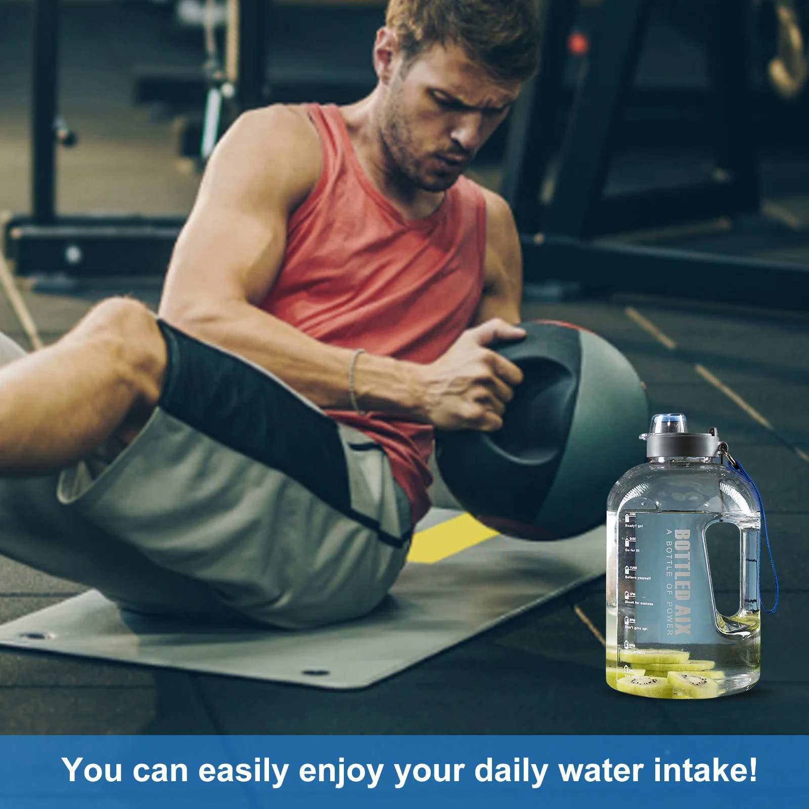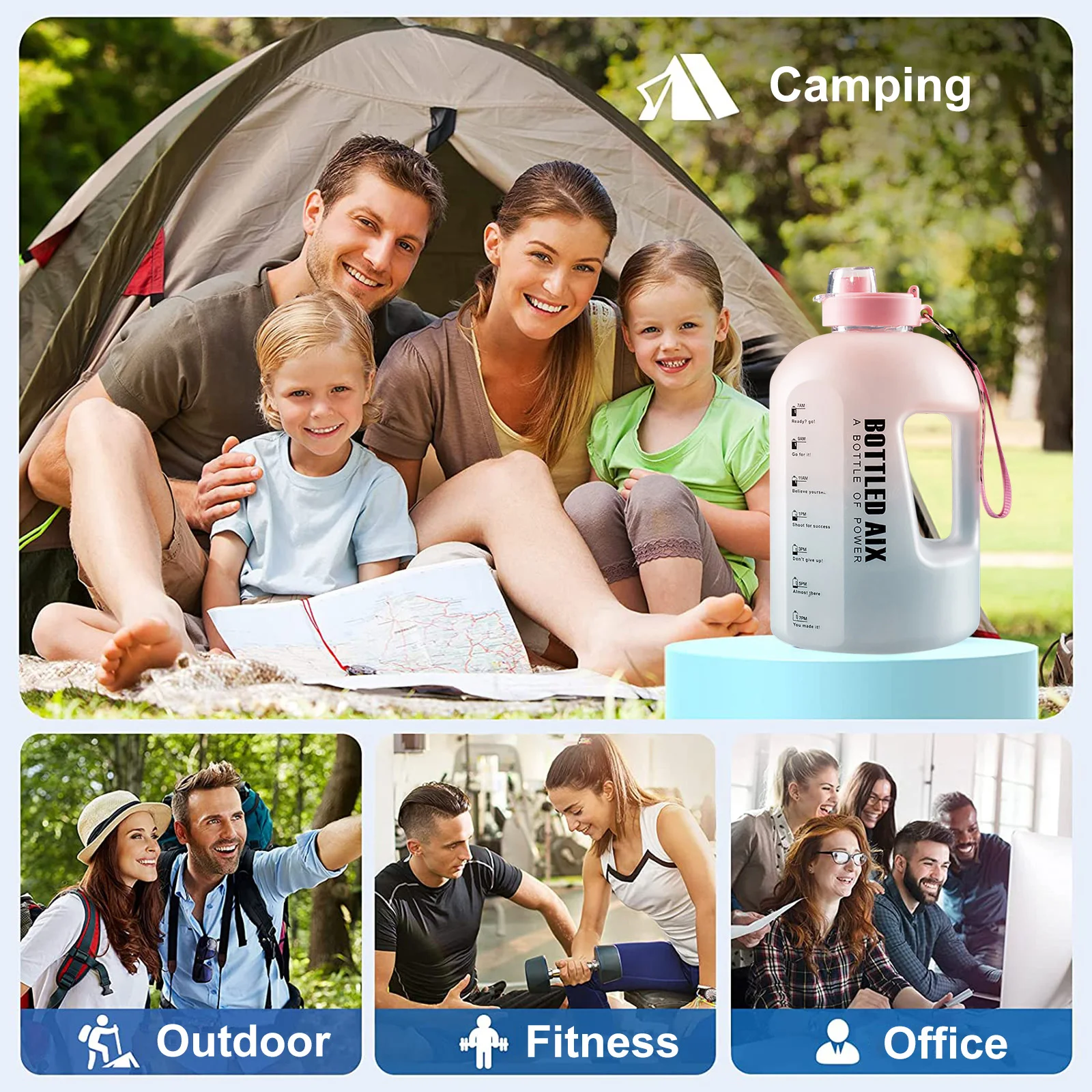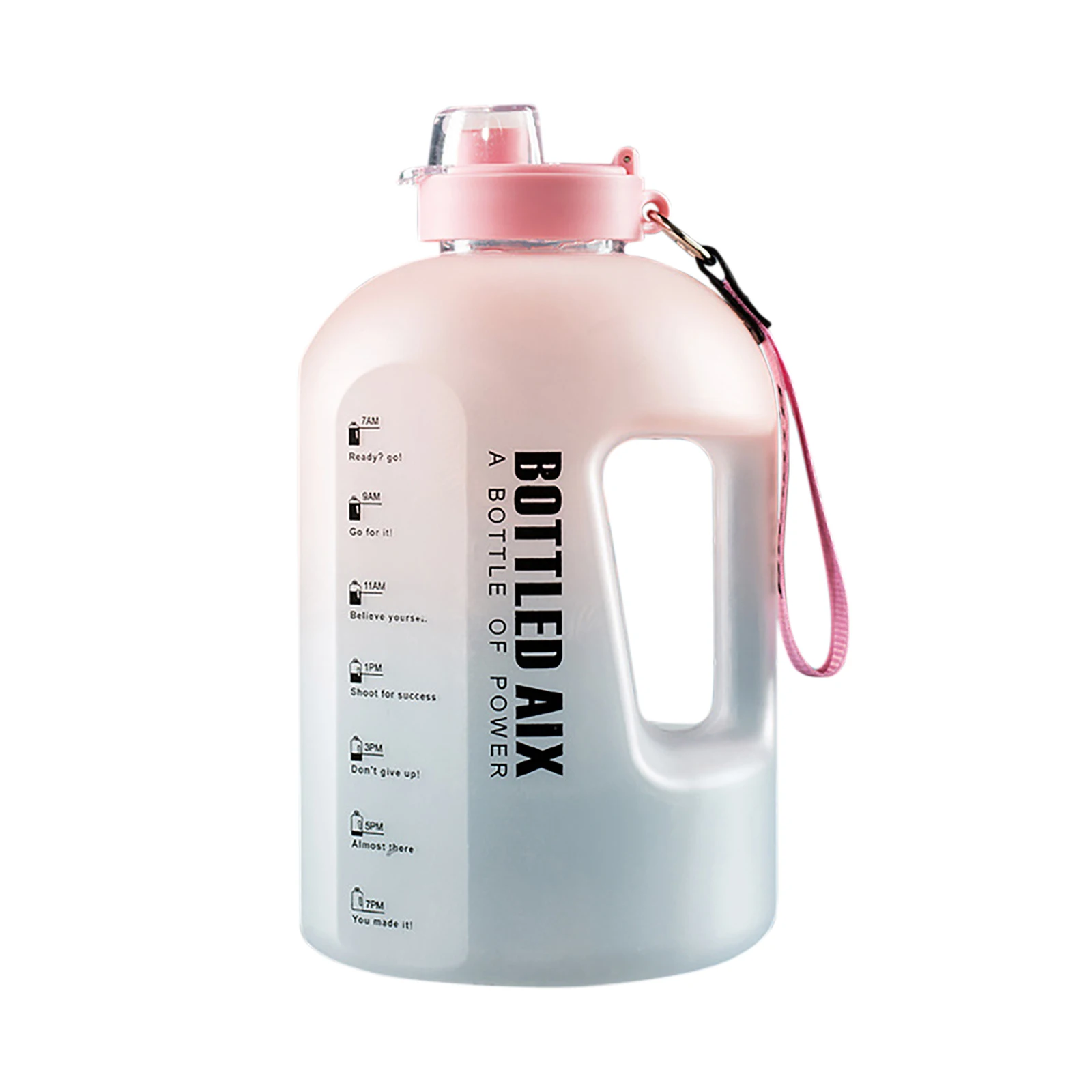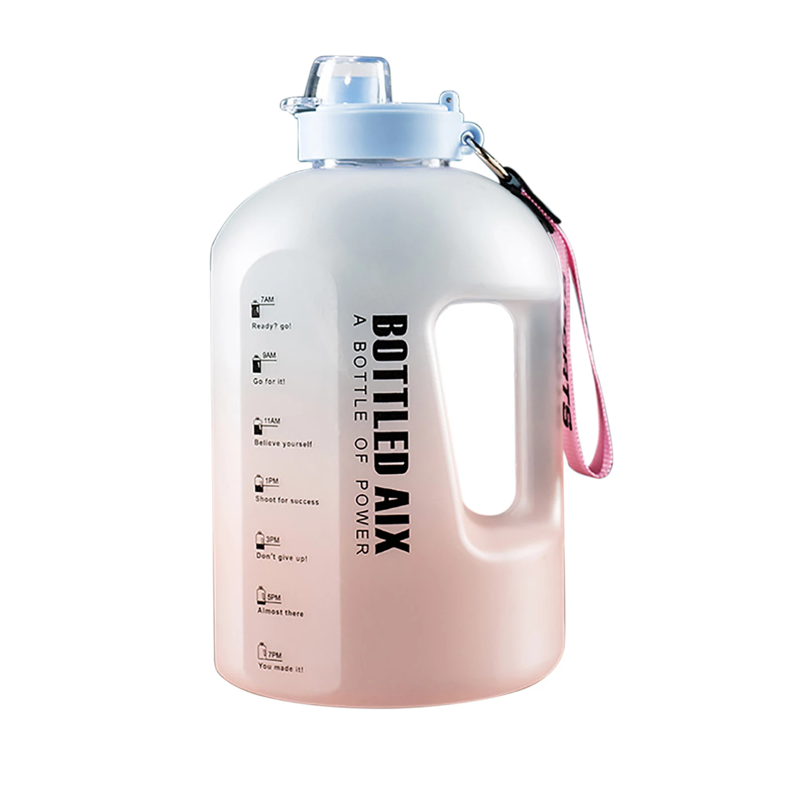 Feature: Motivational Time Marker: The water bottle comes with a unique motivational message, a time marker that measures your daily water intake and reminds you to stay hydrated and drink throughout the day. Meet many fitness goals, including weight loss, appetite control, and overall health. In short, a water bottle can help you become healthier. Portable and Large Capacity - The large capacity allows you to enjoy a full bottle of water without frequent refills. The clear appearance helps you easily check how much water you are actually drinking. Wide mouth opening for easy loading of ice cubes and cleaning, reinforced lanyard, handle handle design, can be carried and carried, dual travel mode, easy to carry; PREMIUM MATERIAL: The water bottle is made of pc material, which is reusable and easy to use. The portable rope is made of polyester, which is strong and durable. With Transparent Flip Cover and Wide Mouth Arc Bottle Mouth: Our sports water bottle has a transparent flip cover, which effectively protects the water source from dust. Unscrew the cover, the wide mouth is round and smooth, and you can easily enjoy your daily water intake. SUITABLE FOR MULTIPLE SCENARIO: This gallon water bottle has a sturdy handle and hand strap, ideal for exercising, running, hiking, biking, camping, yoga or any other physical activity. Also, it can be a suitable gift. Specification: Material: PC Color: Gradient purple/gradient blue/gradient green/gradient pink/transparent blue/transparent grey/transparent black/transparent powder Capacity: 2.2L/ 0.5812 gallons Size: 28x144cm/11.02x56.69in Note: Due to the different monitor and light effect, the actual color of the item might be slightly different from the color showed on the pictures. Thank you! Please allow 1-2mm measuring deviation due to manual measurement.