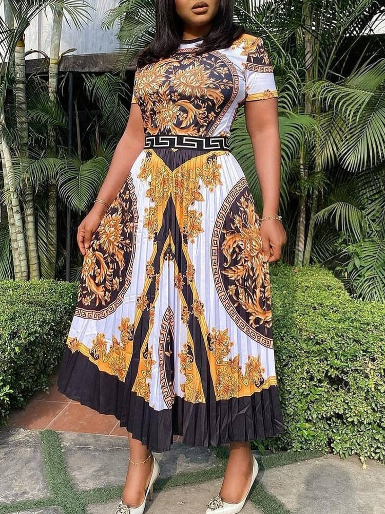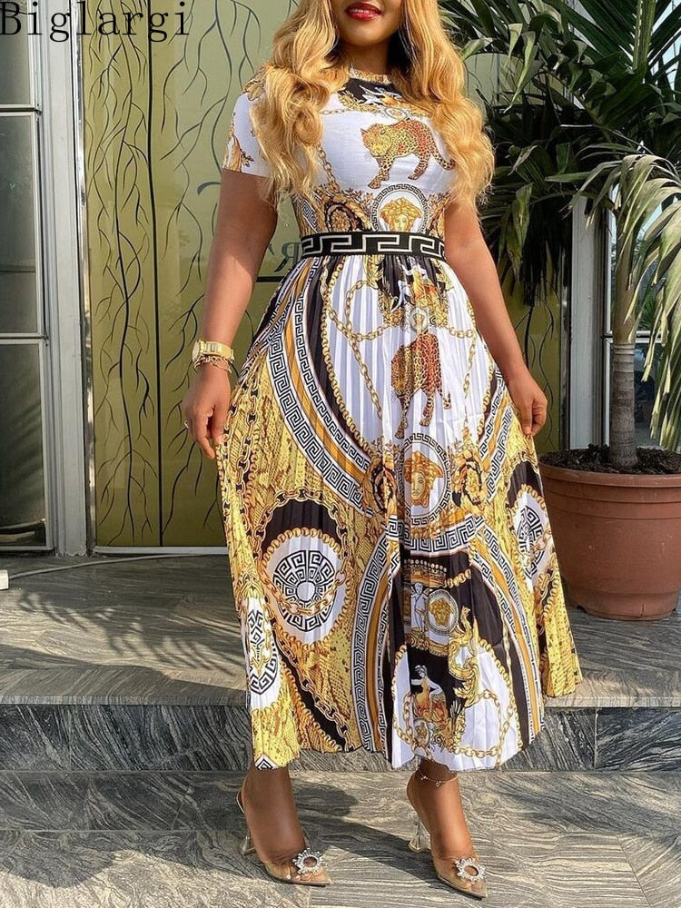 2023 Fashion Hig Waist Print Pleated Dress Summer Patchwork Women Leopard Dress Casual New Ladies Womens Pullover Long Dress