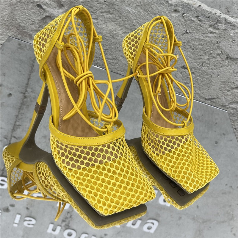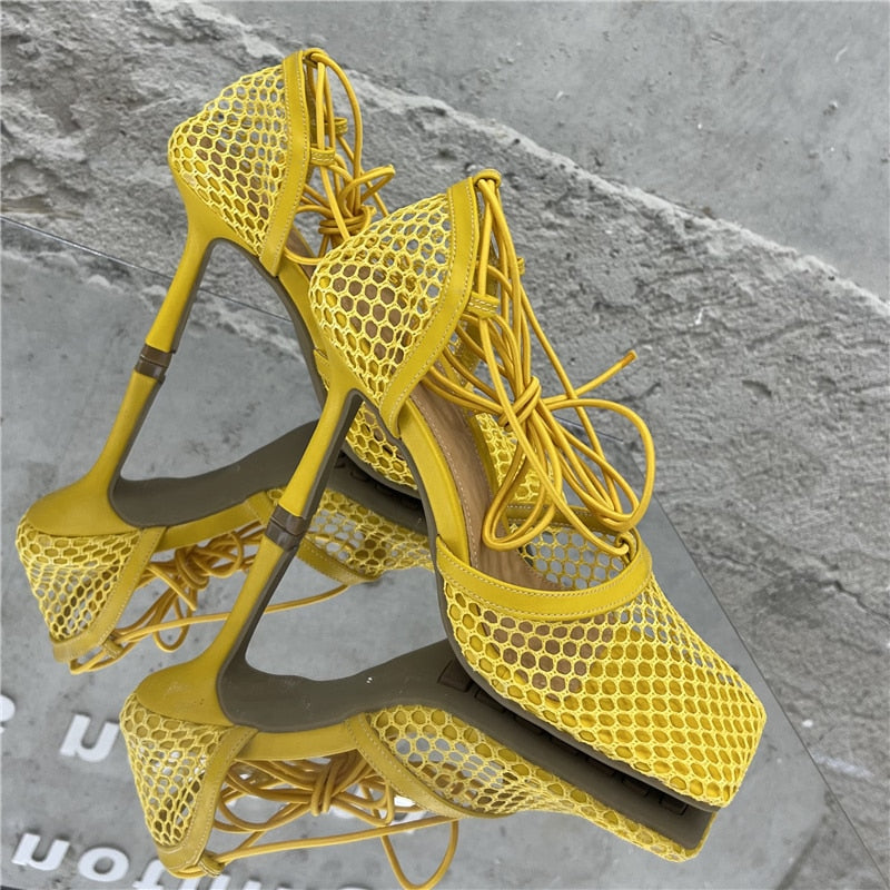 2023 Women Summer Sandals 10cm High Heels Female Square Toe Roman Casual Cross Toe Sandles Yellow Green Mesh Strap Pleaser Shoes