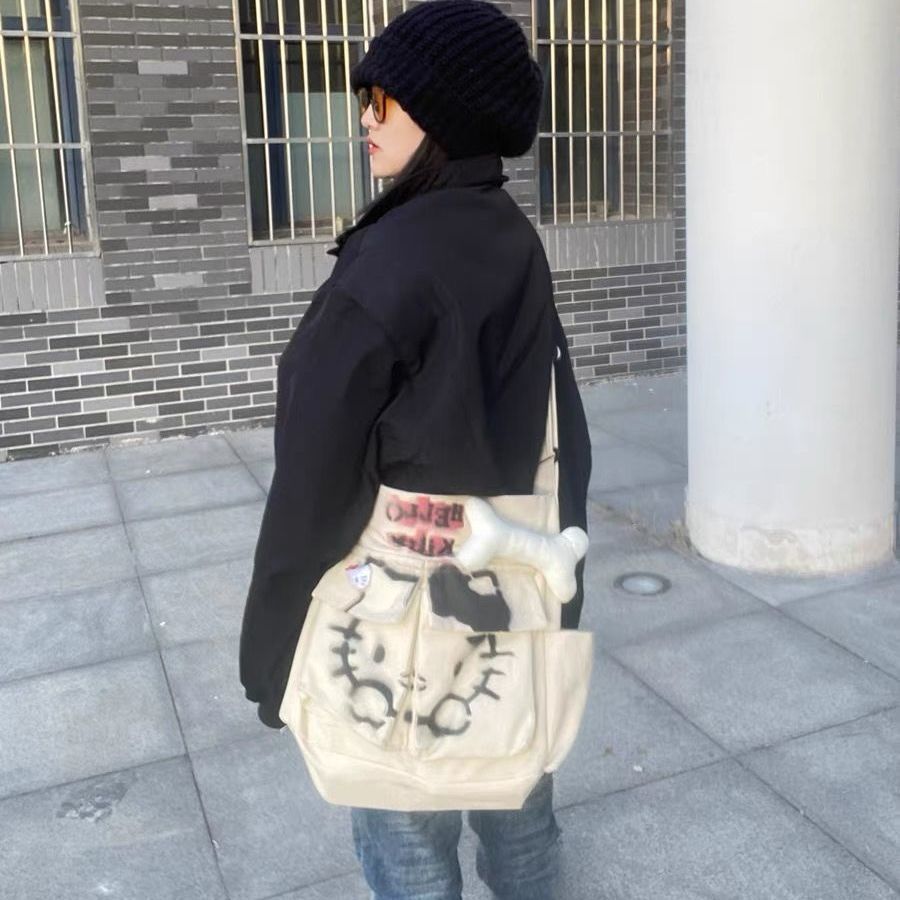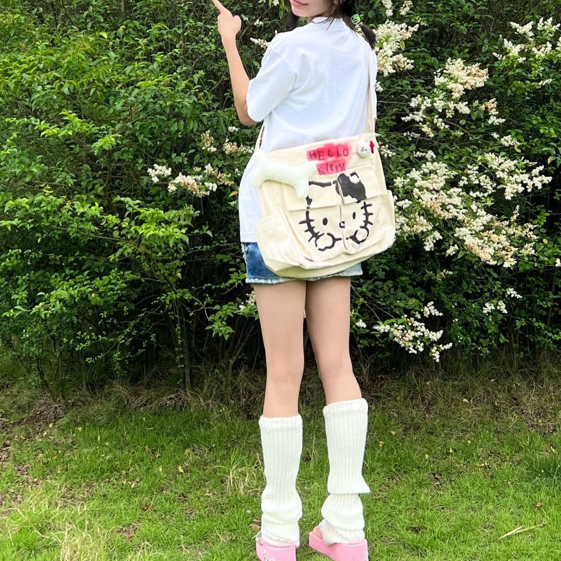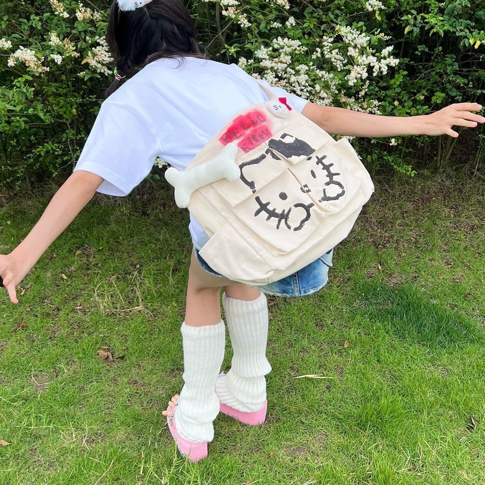 Backpacks for Women cute Hello Kitty Hand-Painted Inkjet Distressed Cotton Linen Millennium Hot Girl Messenger Trendy Bag