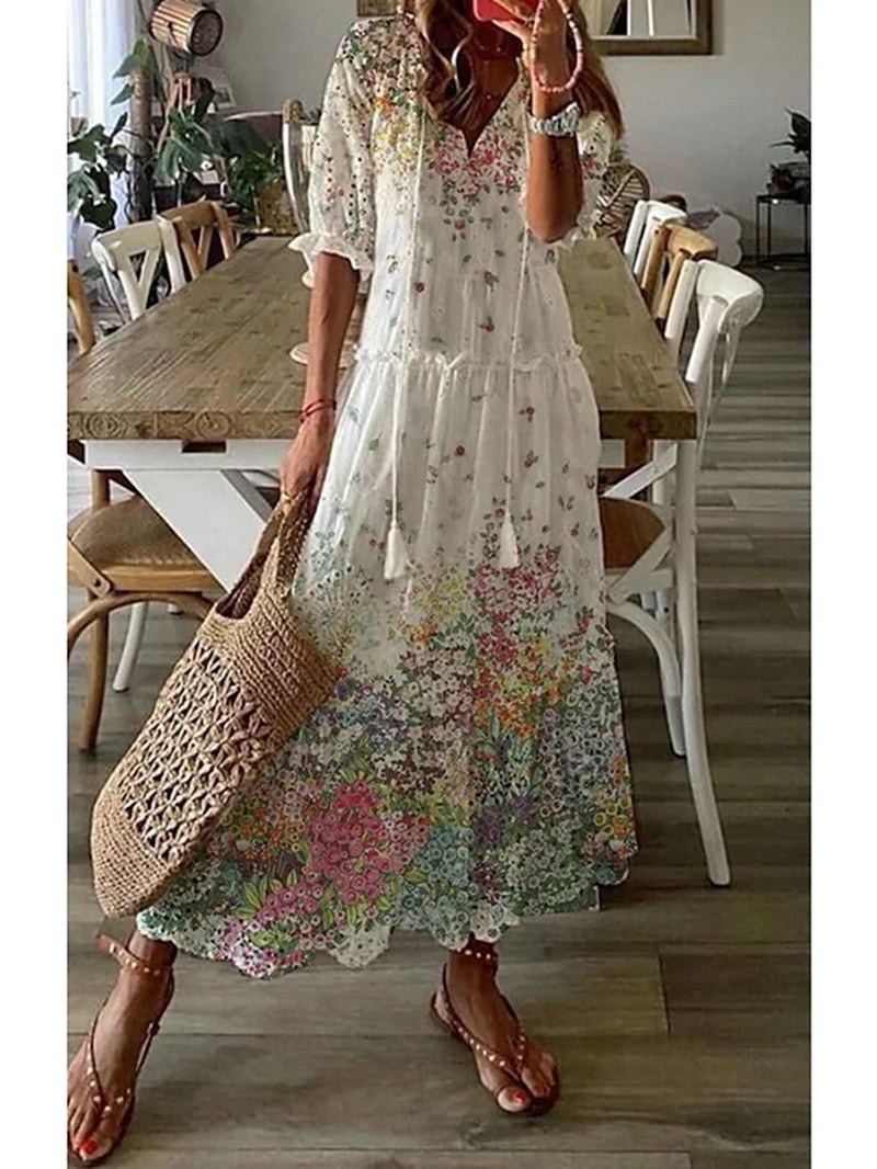 Boho Maxi Dress Women Summer 2023 V Neck Loose Long Dresses Geometric Print Vintage Holiday Beach Casual Tie Up Female Vestidos