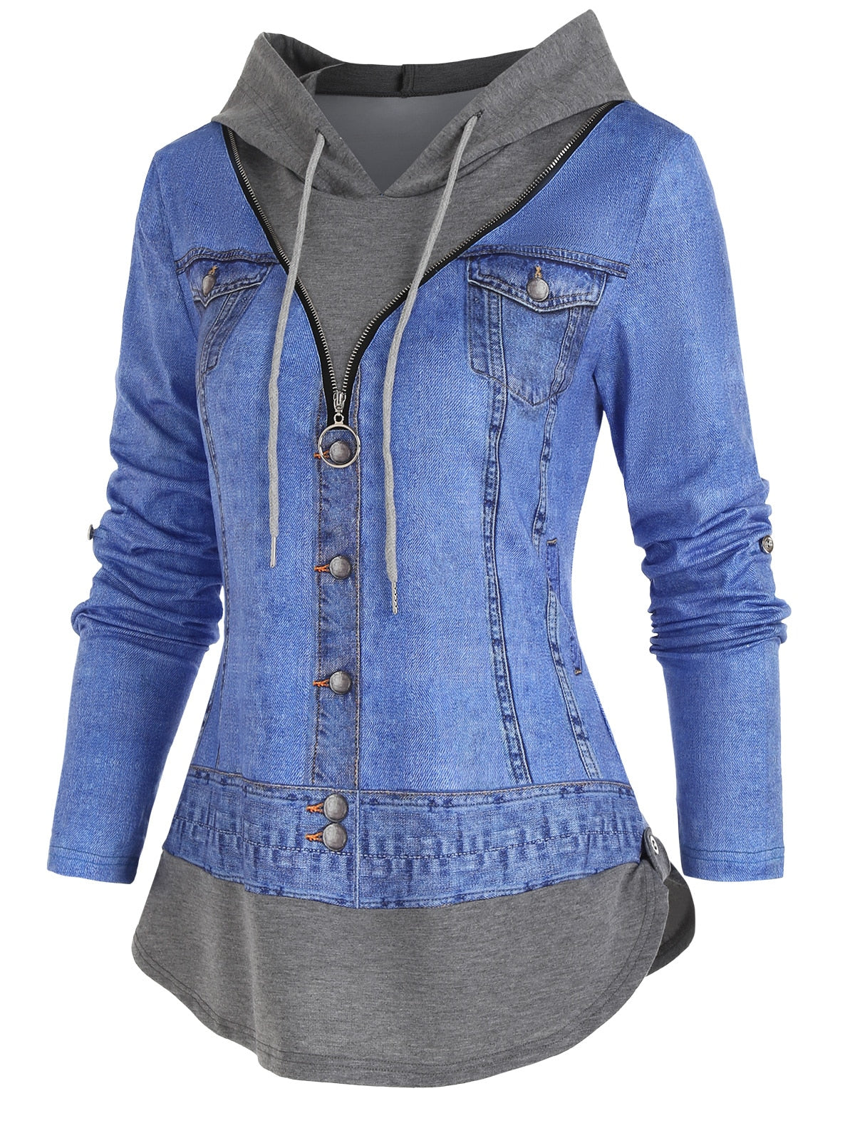 Casual Denim Jacket 3D Print O Ring Zipper Hooded Faux Twinset T Shirt Women False Two Piece Long Sleeve Tee