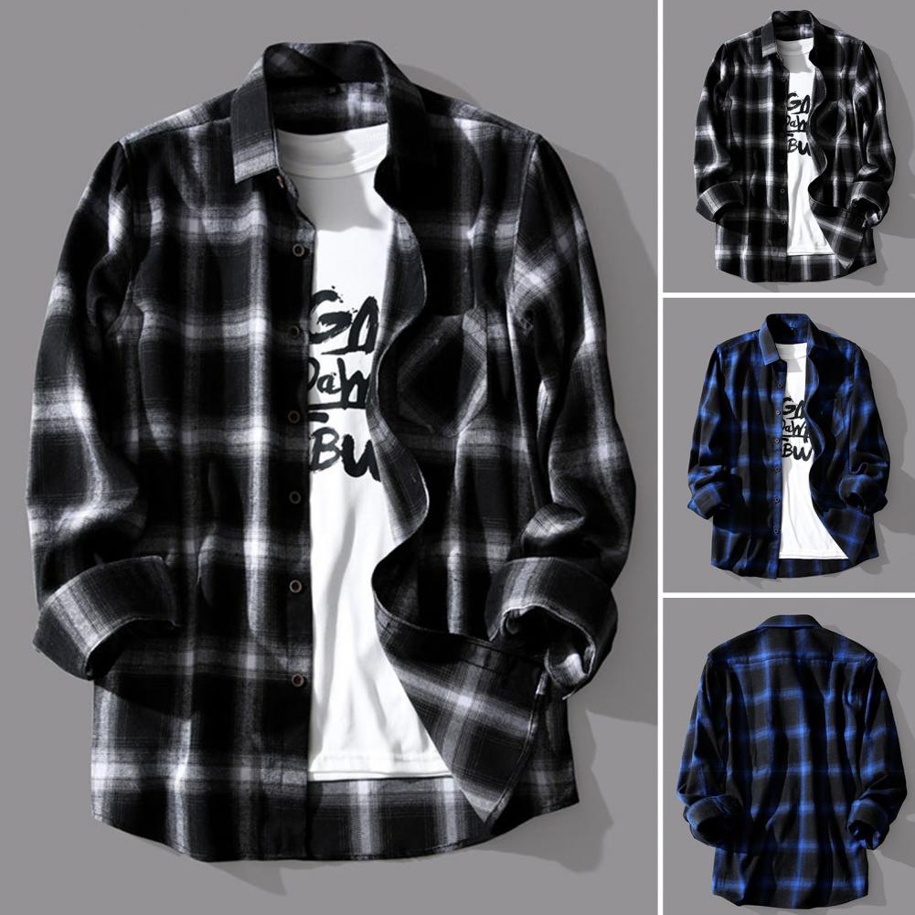 Chic Men Spring Shirt Plaid Print Soft Men Autumn Shirt Cardigan Wear-resistant Spring Shirt