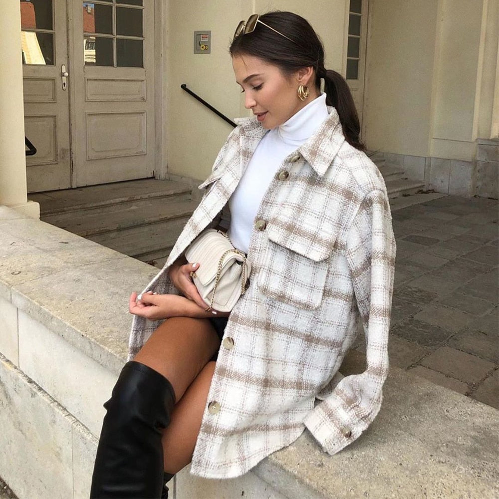New Autumn Winter Women Jacket Checked Coat Long Sleeves Oversized Thicken Casual Fashion Women Coats Tops