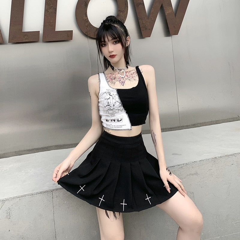 Punk Style Patchwork Tank Tops Aesthetic Letter And Graphic Print Women Crop Top Color Blocking Sleeveless Streetwear