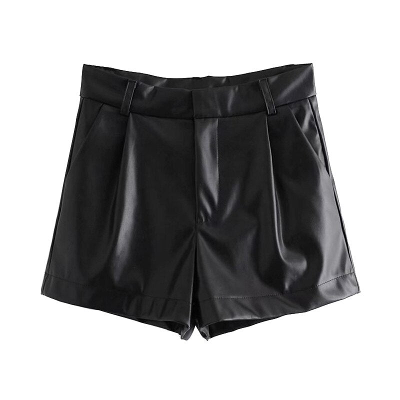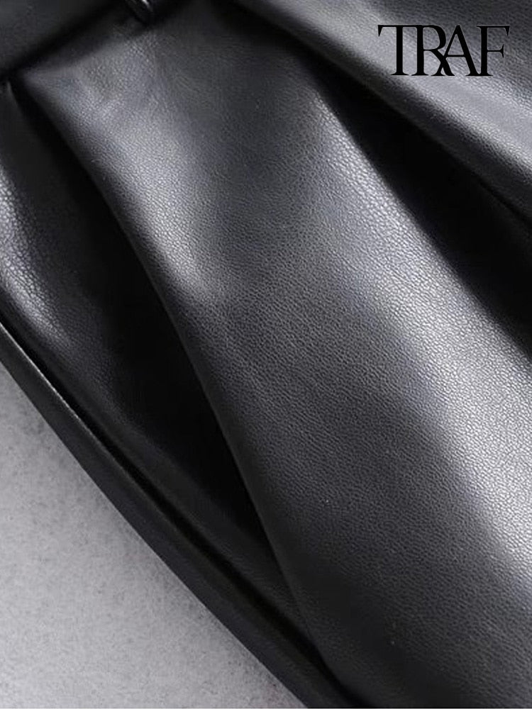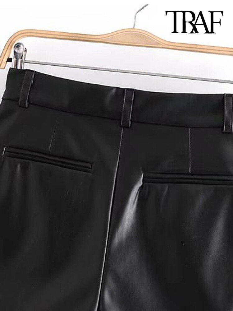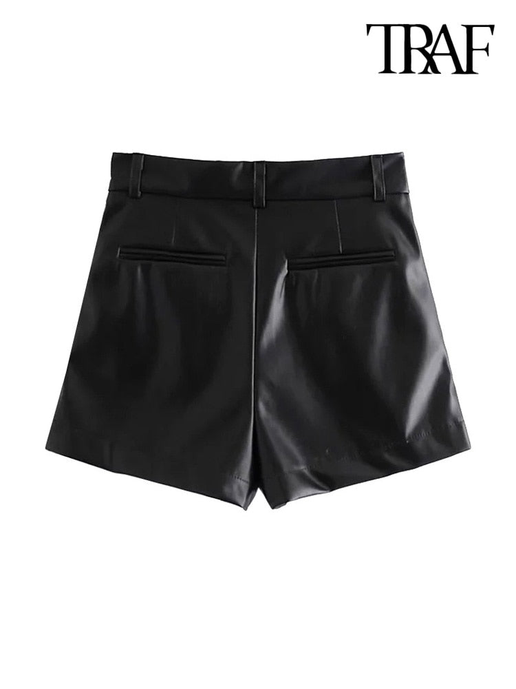 TRAF Women Chic Fashion Side Pockets Faux Leather Shorts Vintage High Waist Zipper Fly Female Short Pants Mujer